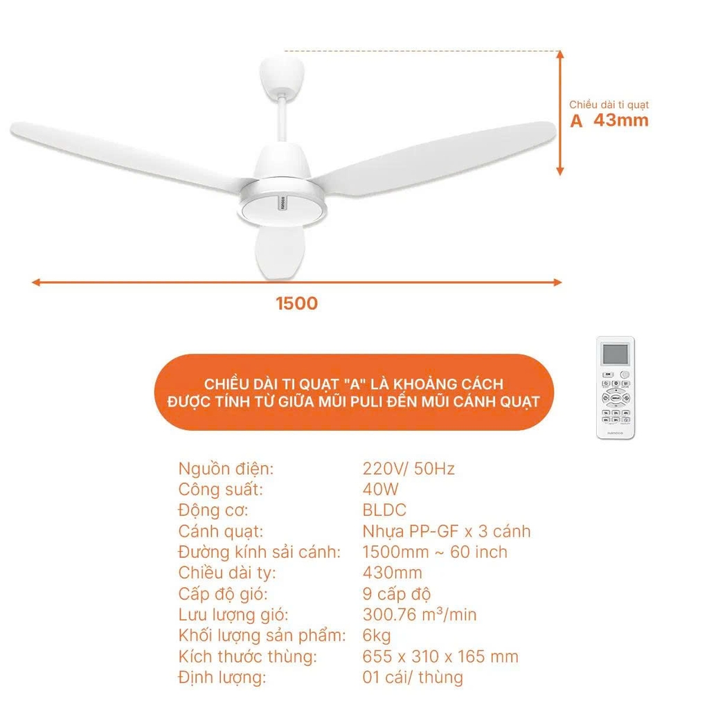 Sản phẩm sử dụng động cơ BLDC tiết kiệm điện, công suất 40W, cho khả năng vận hành êm ái, ổn định và bền bỉ theo thời gian. Hệ thống 3 cánh quạt bằng nhựa PP-GF chắc chắn, đường kính cánh 1500mm, tạo lưu lượng gió lớn lên đến 300,76 m³/phút, mang lại cảm giác mát mẻ nhanh và đồng đều cho không gian rộng.